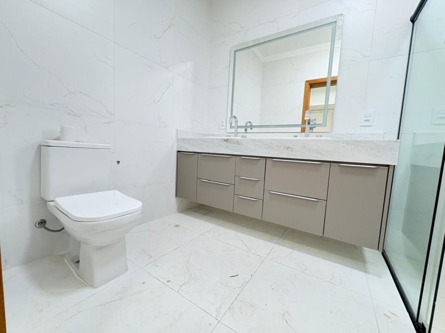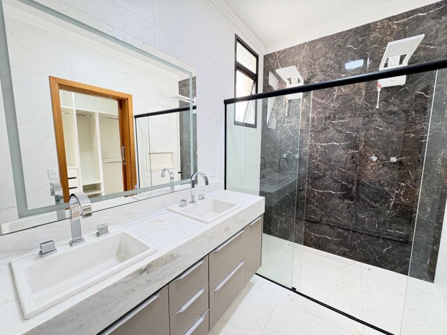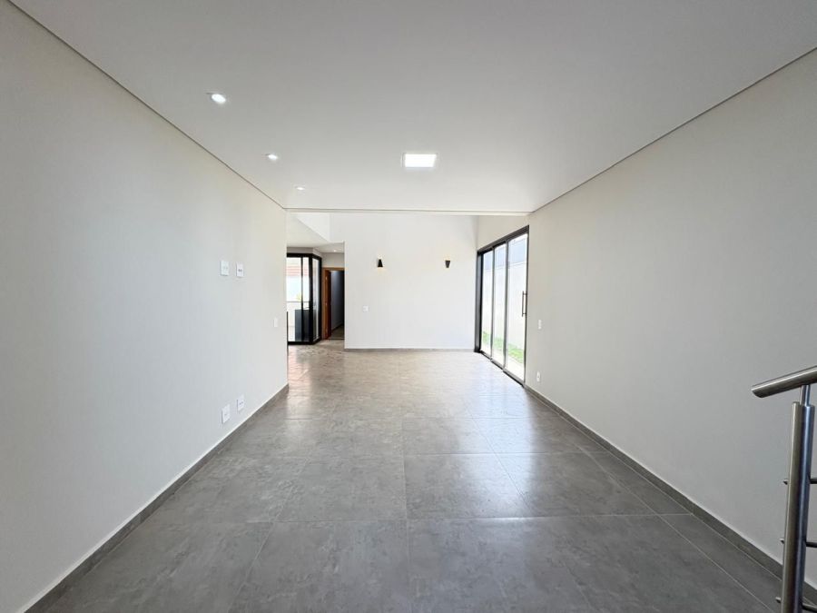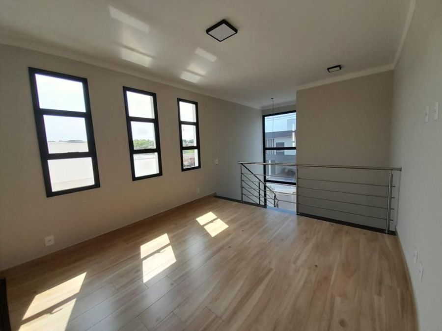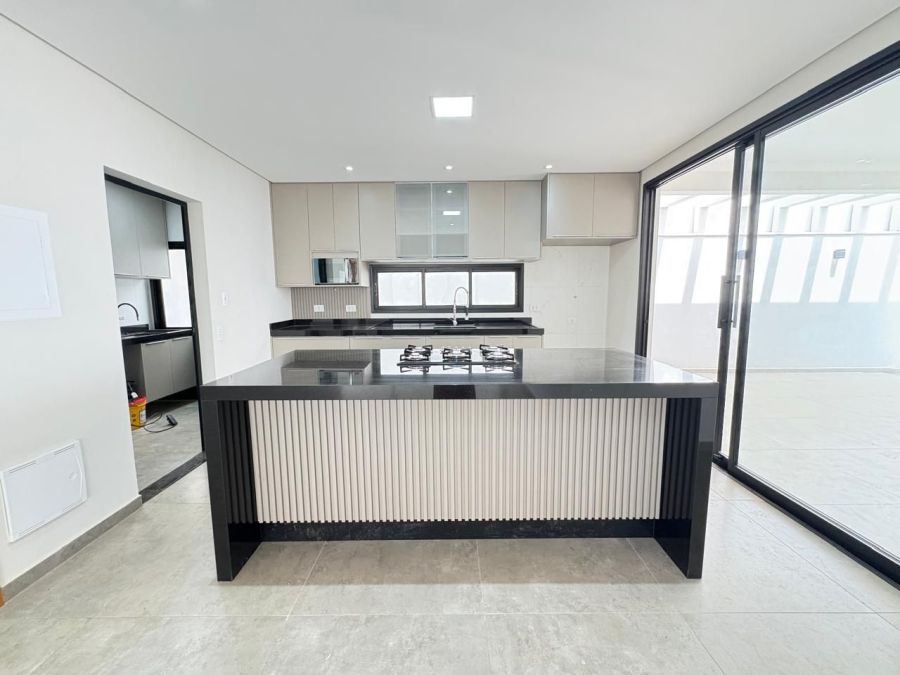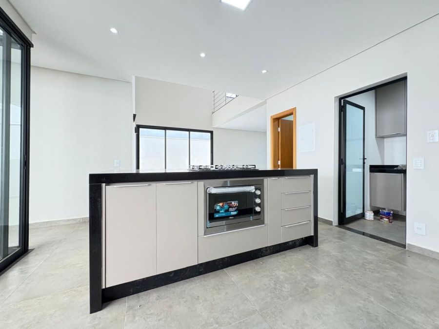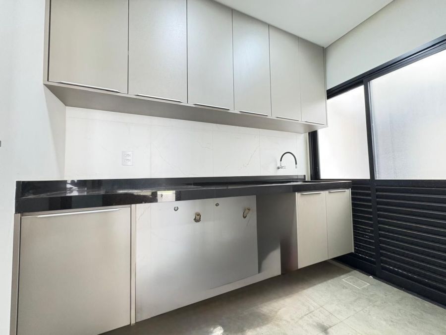 Esta excelente casa possui 3 dormitórios sendo 3 suítes, sala espaçosa com dois ambientes e pé-direito duplo, lavabo moderno, cozinha planejada, escritório para home office, despensa, banheiros completos, área de serviço com armários, espaço gourmet com churrasqueira, banheiro externo, quintal gramado e 4 vagas de garagem. Condomínio com portaria controlada e segurança 24 horas.